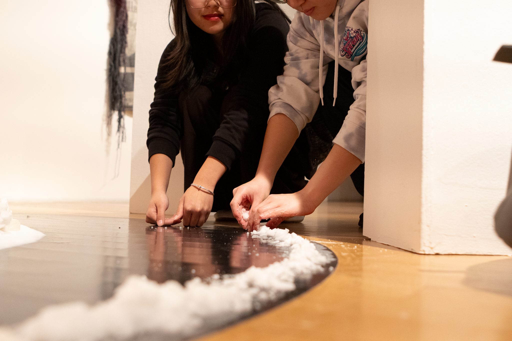 The piece was paired with a cathartic and vulnerable performance from artist Eva Salazar, who walked through the gallery with clay painted on her body while releasing emotional breaths and cries to convey the harsh impact left on survivors of sexual violence.