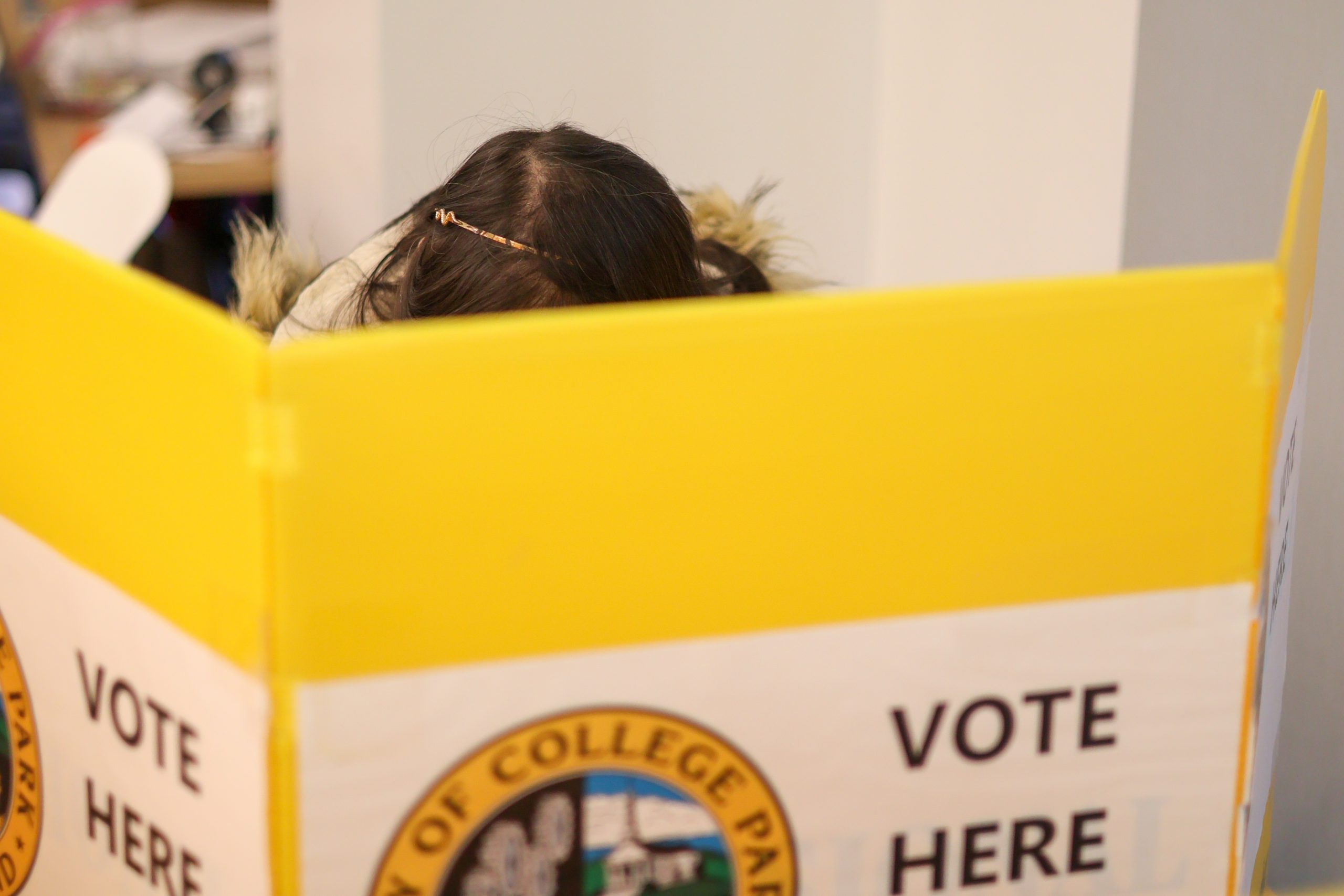 A person votes inside the polling site at College Park City Hall on Nov. 4, 2025. This election selected the mayor and city council seats for the City of College Park. (Jonathan Peter Belling/The Diamondback)