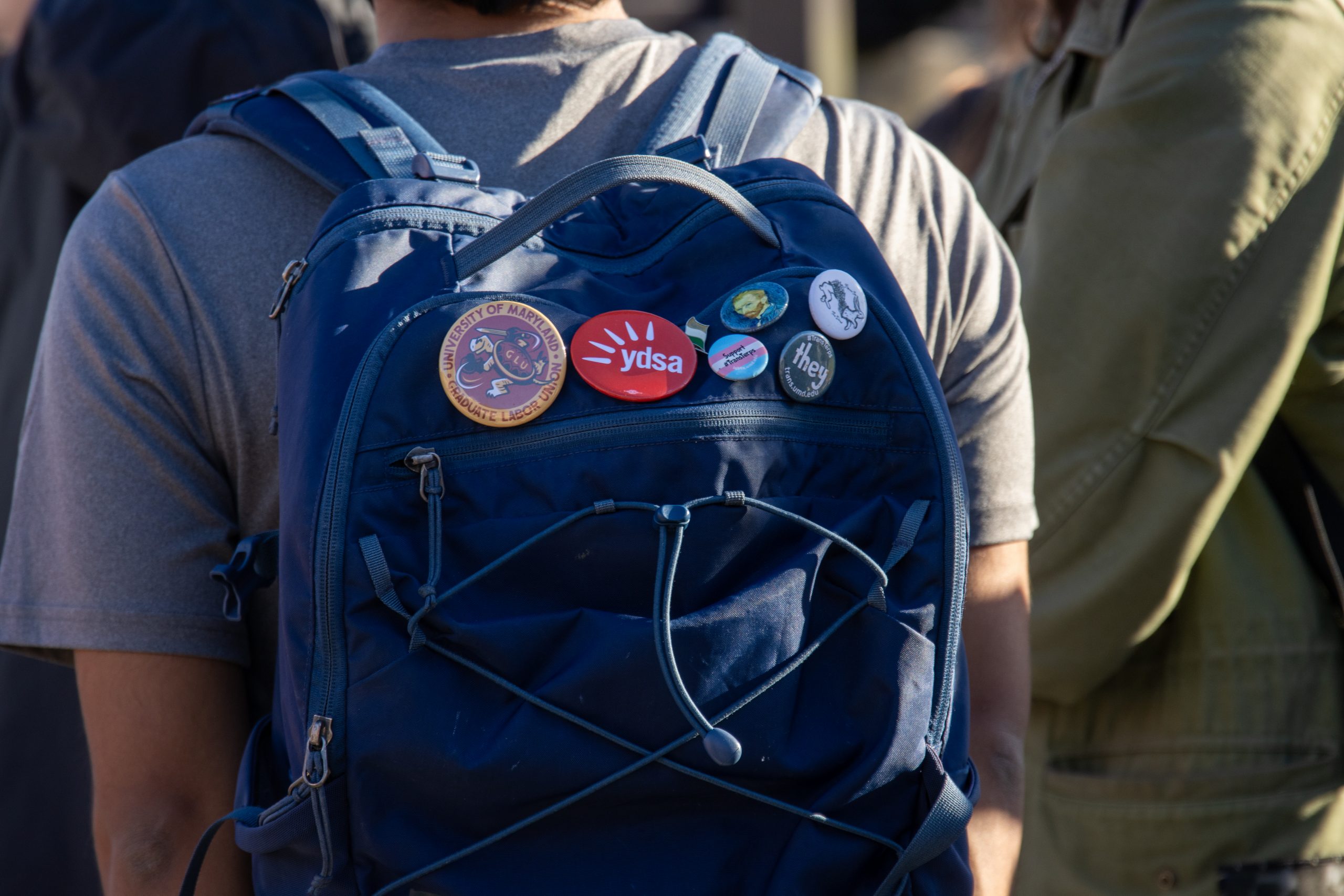 A person wears a backpack with various pins on Nov. 4, 2025. (Sam Cohen/The Diamondback)