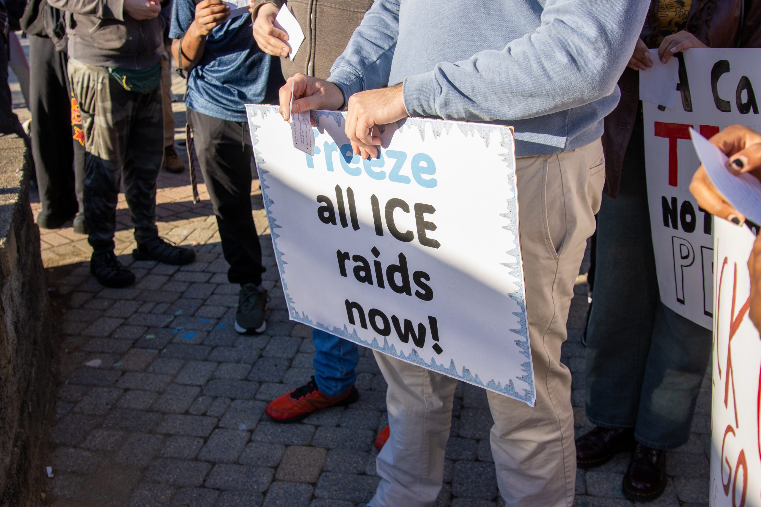 A sign reads “Freeze all ICE raids now!” at this university’s Young Democratic Socialists of America chapter’s rally and march to keep U.S. Immigration and Customs Enforcement off campus on Nov. 4, 2025. (Sam Cohen/The Diamondback)