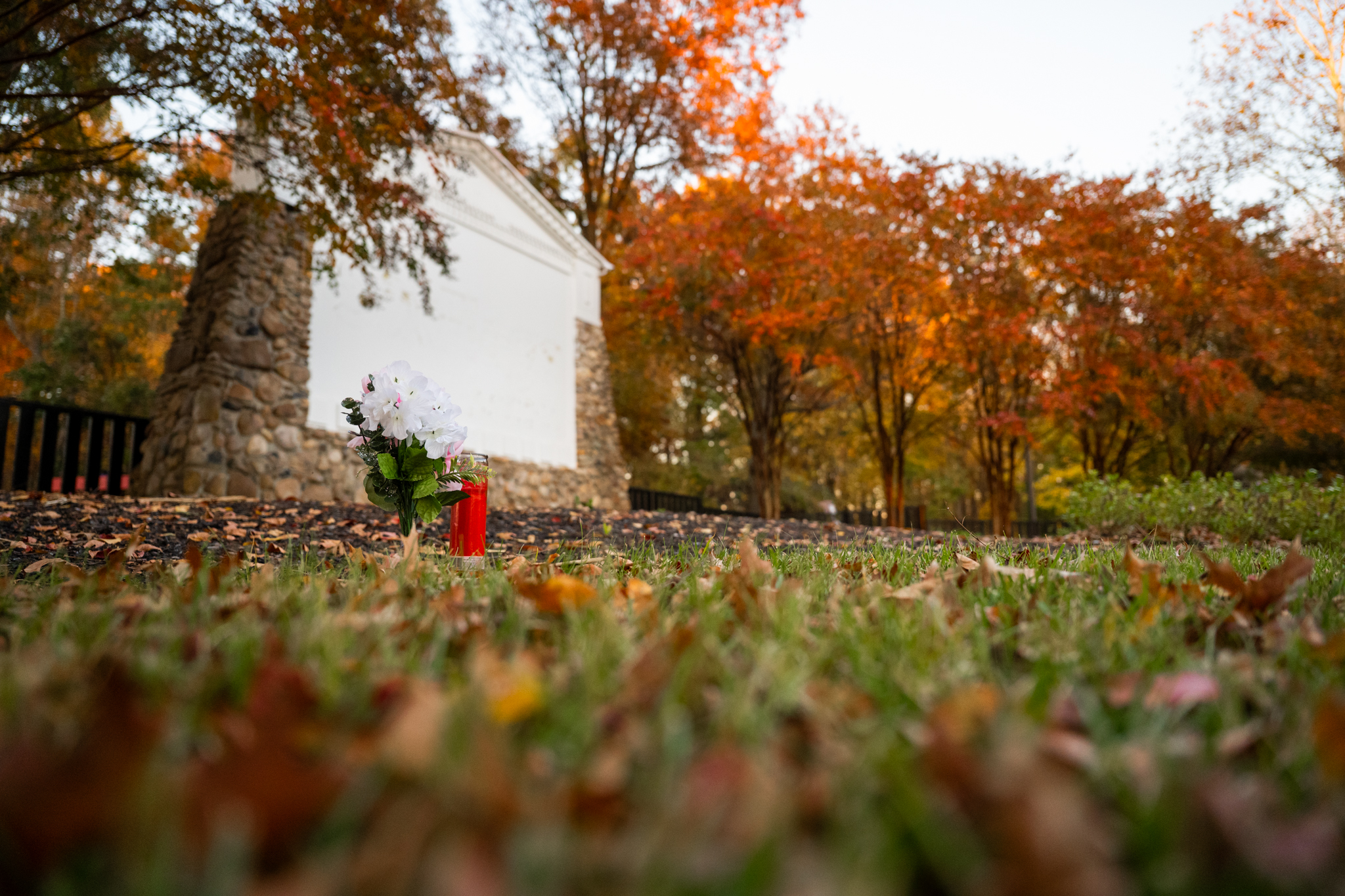 A memorial in front of a blank sign that used to read “Six Flags America” in Bowie, on Nov. 3, 2025. (Ryan Bowie/The Diamondback)