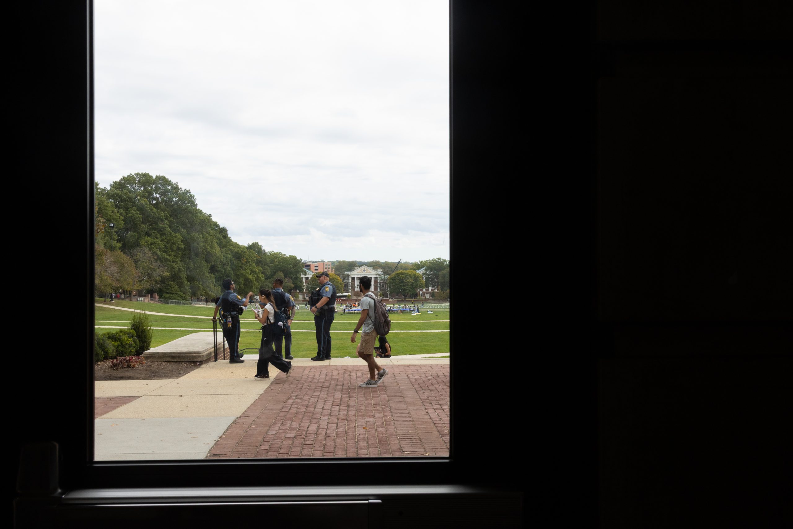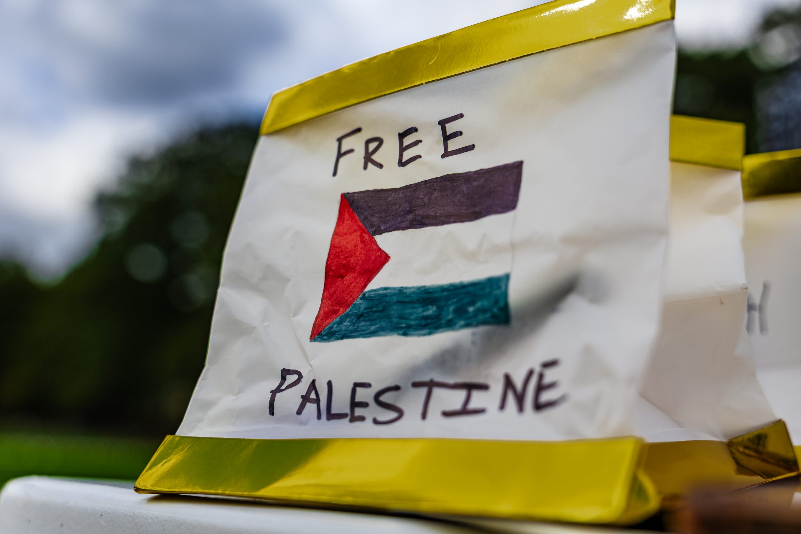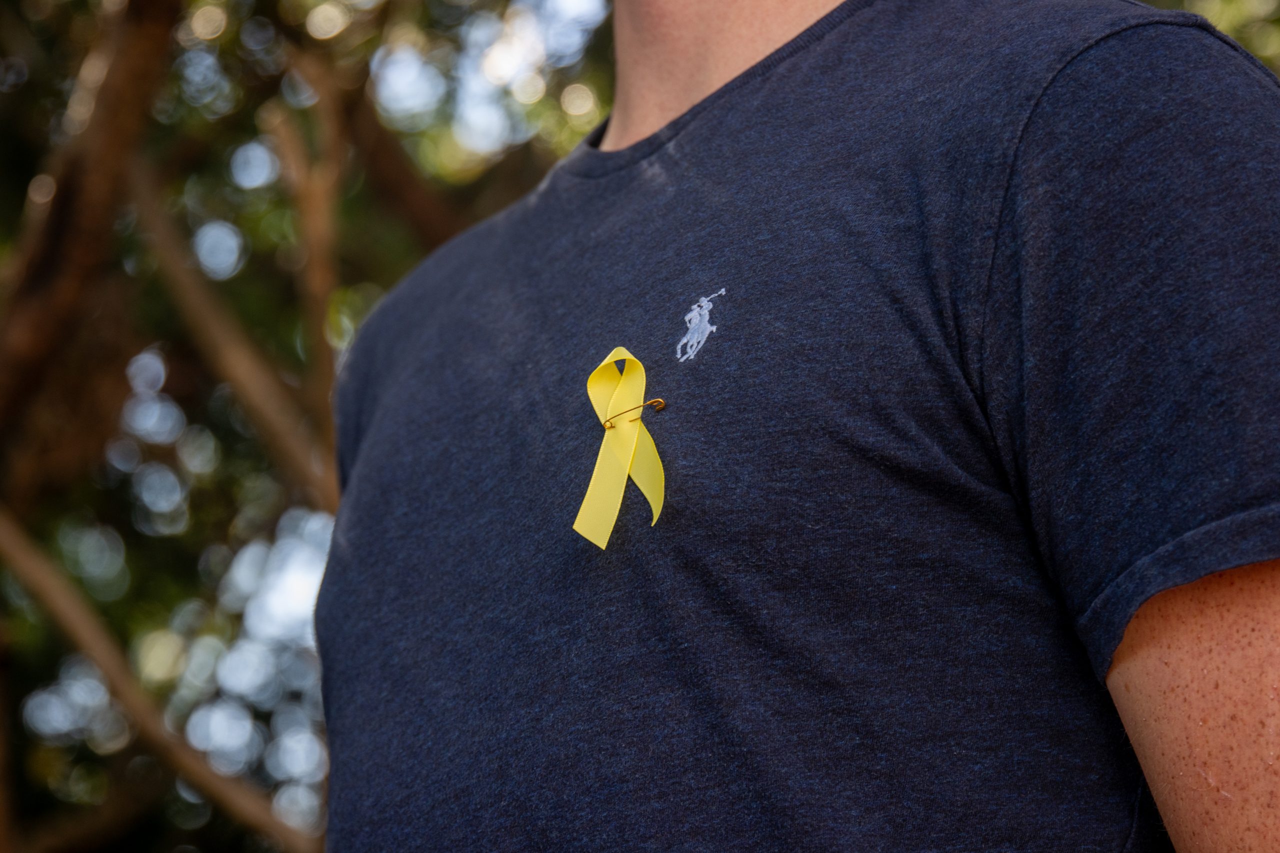 Alex Mullin, a junior mechanical engineering major, wears a yellow ribbon to support the return of the hostages taken by Hamas, outside of the Memorial Chapel on Oct. 6, 2025. (Sam Cohen/The Diamondback)