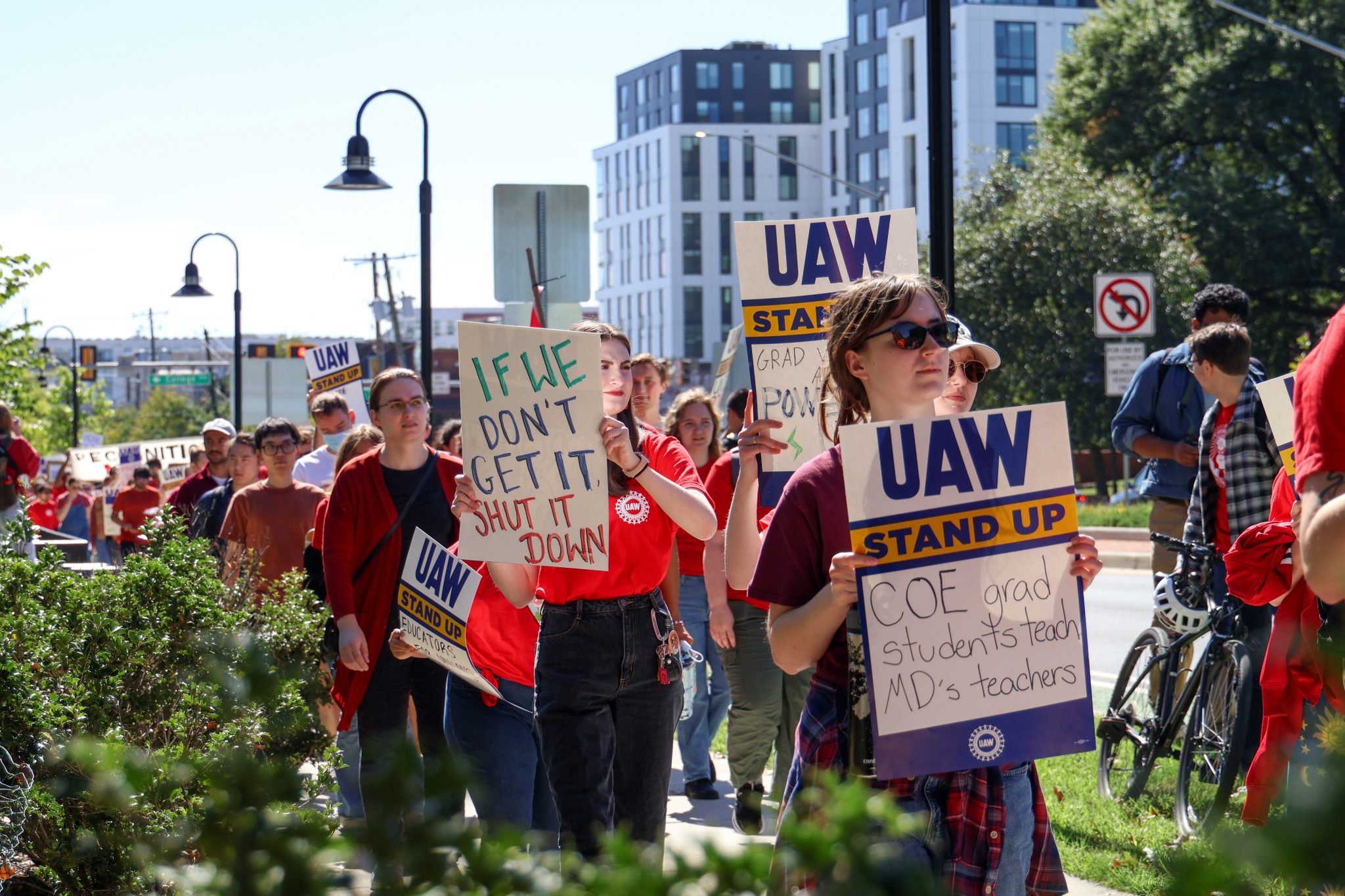 Protesters march, chant and hold signs along Route 1 on Oct. 1, 2025. The university’s Graduate Labor Union, formerly known as Fearless Student Employees, fights for collective bargaining rights. (Jonathan Peter Belling/The Diamondback)