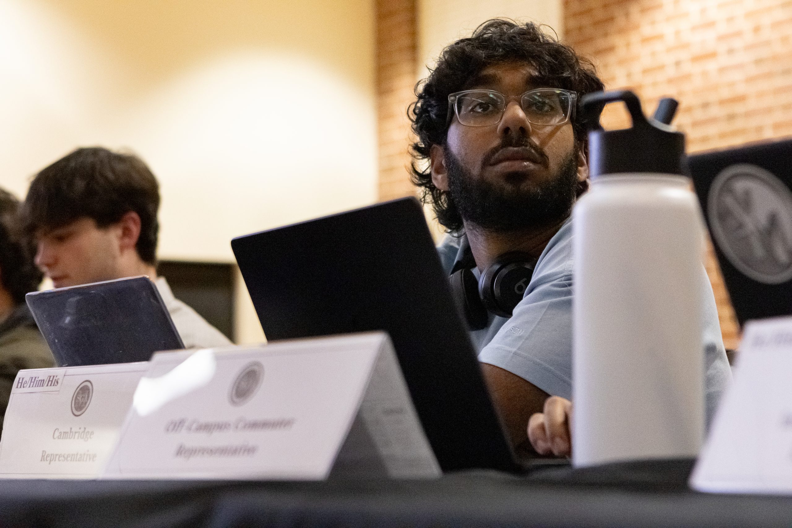 Cambridge Representative Isa Ali looks at a speaker during the Student Government Associaitons general body meeting located in Stamp Student Union on Sept. 17, 2025. (Clare Roth/The Diamondback)