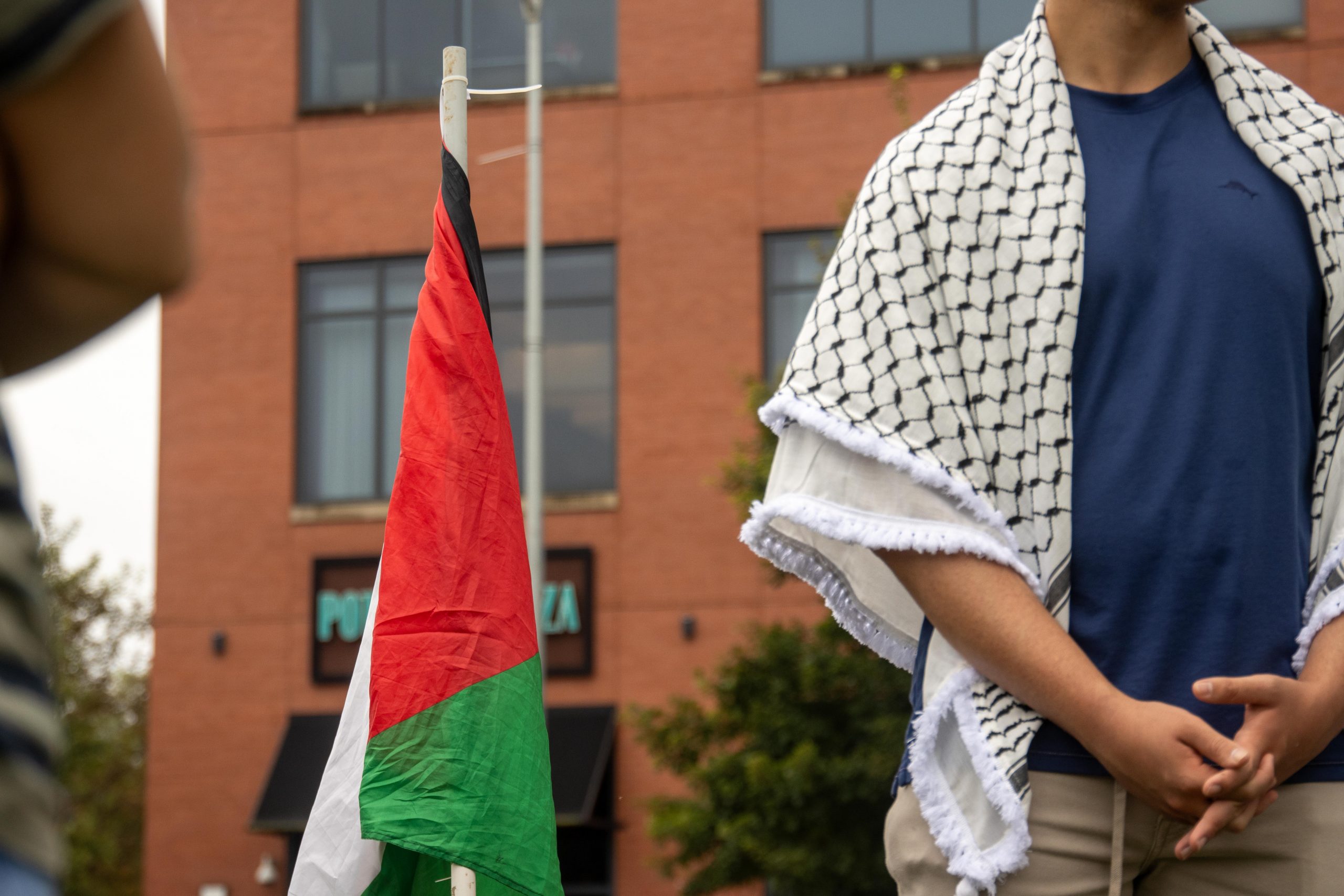 A person wearing a keffiyeh stands next to a Palestinian flag at a protest against certain employers hosted at the career fair at The Hotel at the University of Maryland on Sept. 25, 2025. (Sam Cohen/The Diamondback)