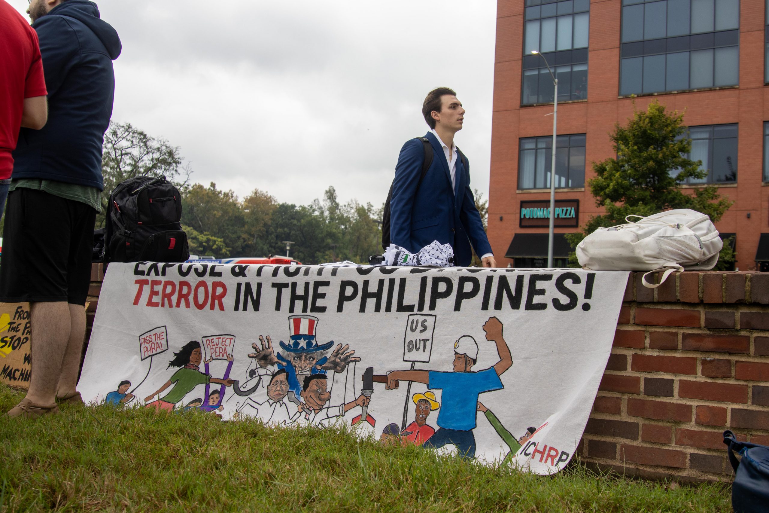 A person dressed in professional attire walks past a Committee for Human Rights in the Philippines chapter banner at the Engineering Fields on Sept. 25, 2025. The banner was a part a protest hosted by multiple campus organizations against defense contractors hosted at the STEM career fair. (Sam Cohen/The Diamondback)
