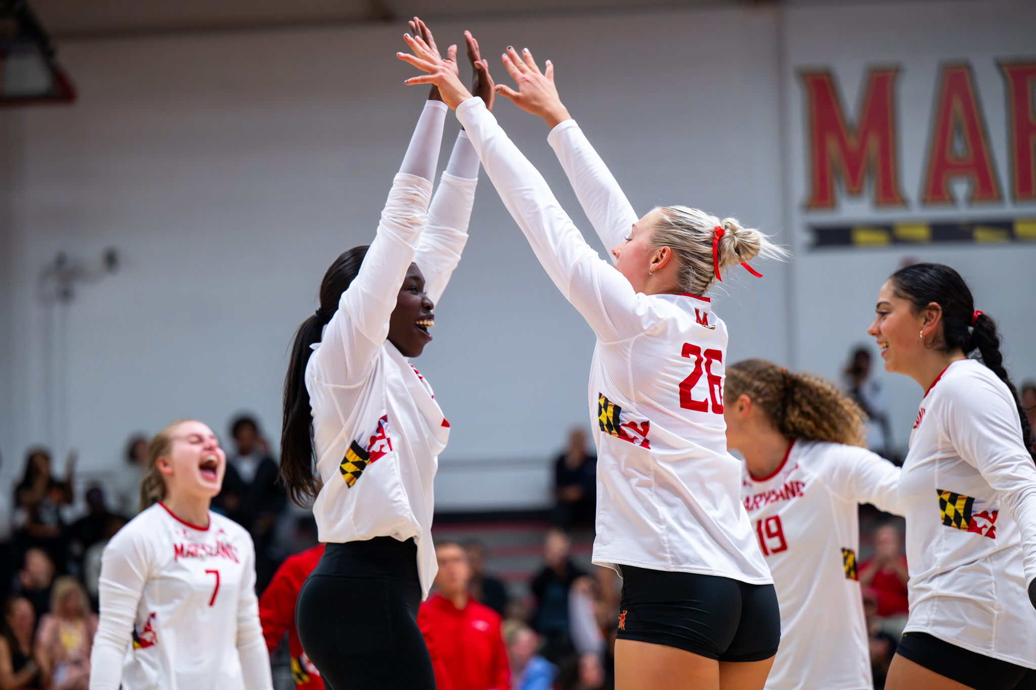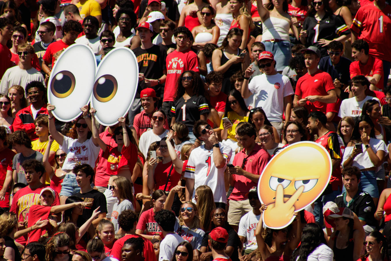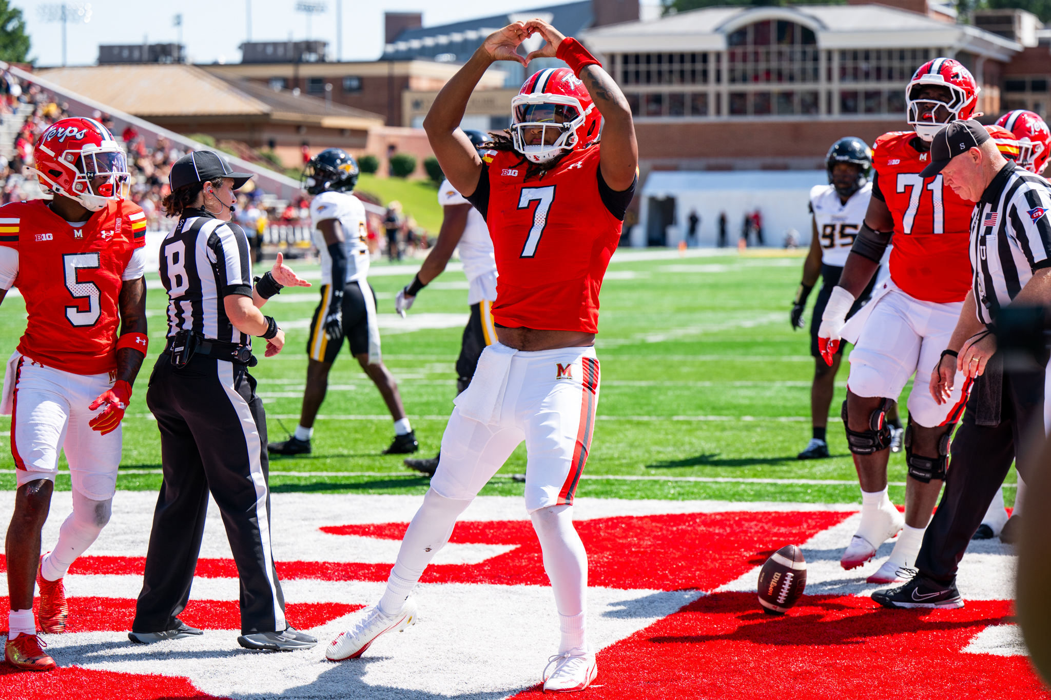 Quarterback Malik Washington celebrates a touchdown during Maryland football’s 44-17 win over Towson on Sept. 13, 2025. (Ryan Bowie/The Diamondback)