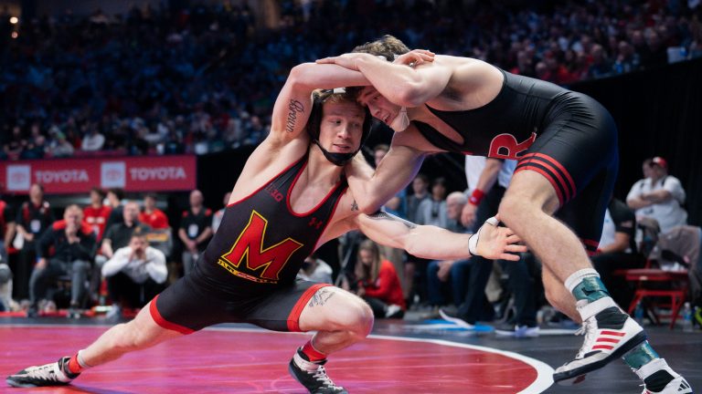 Dominic Solis during his 17-14 loss to Rutgers’ Jackson Turley on March 9, 2024. (Eric Robinson/The Diamondback) Seth Nevills controls Gannon Rosenfeld of Wisconsin during…