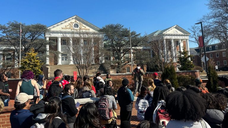 Los estudiantes protestan por la disposición de UMD de alojar al ICE, a los contratistas de defensa en la feria del empleo de primavera
