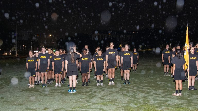 ROTC cadets stand on Chapel Field on the morning of Sept. 11, 2025. (Sam Cohen/The Diamondback) ROTC cadets jog along Regents Drive the…